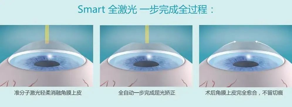2、半飞秒 ?半飞秒则是由飞秒激光加准分子激光共同完成的一个手术。用飞秒激光制作角膜瓣,掀开角膜瓣后通过准分子激光在角膜的基质层进行精zhun激光切削,再把掀开的角膜瓣复位手术即完成。 半飞秒矫正度数范围:近视度数在1200度,散光低于600度。3、Smart全激光 ?Smart全激光是表层角膜屈光手术方式,激光直接经角膜上皮进行治疗,一步完成角膜上皮切割和屈光不正的矫正。 Smart全激光矫正度数范围:近视100-600度,散光400度以内。